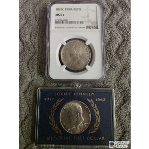 특징: 동전 뒷면에는 중앙에 'ONE RUPEE INDIA 1887'이라는 문구가 있으며, 화려한 꽃무늬 테두리가 이를 감싸고 있습니다. 앞면에는 당시 인도 제국의 황제였던 빅토리아 여왕의 초상이 새겨져 있습니다.