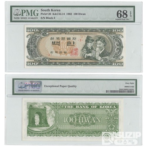 1962년 화폐개혁 모자상 개갑 100환권 매우 귀한 판번호 3번 PMG 68등급