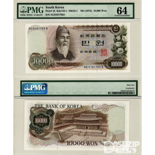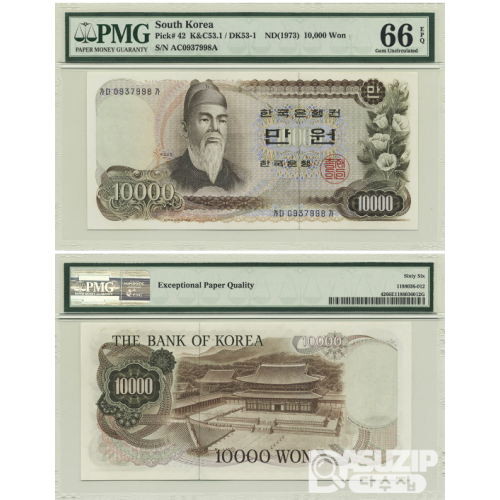 그레이딩 지폐: 1973년 가 10,000원권(1차) 가다가 09포인트 미사용 1차만원 PMG 66등급